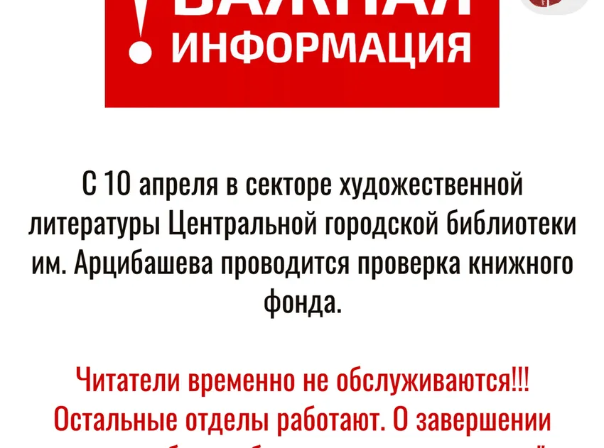 С 10 апреля в секторе художественной литературы Центральной городской библиотеки им. Арцибашева проводится проверка книжного фонда. Читатели временно не обслужи
